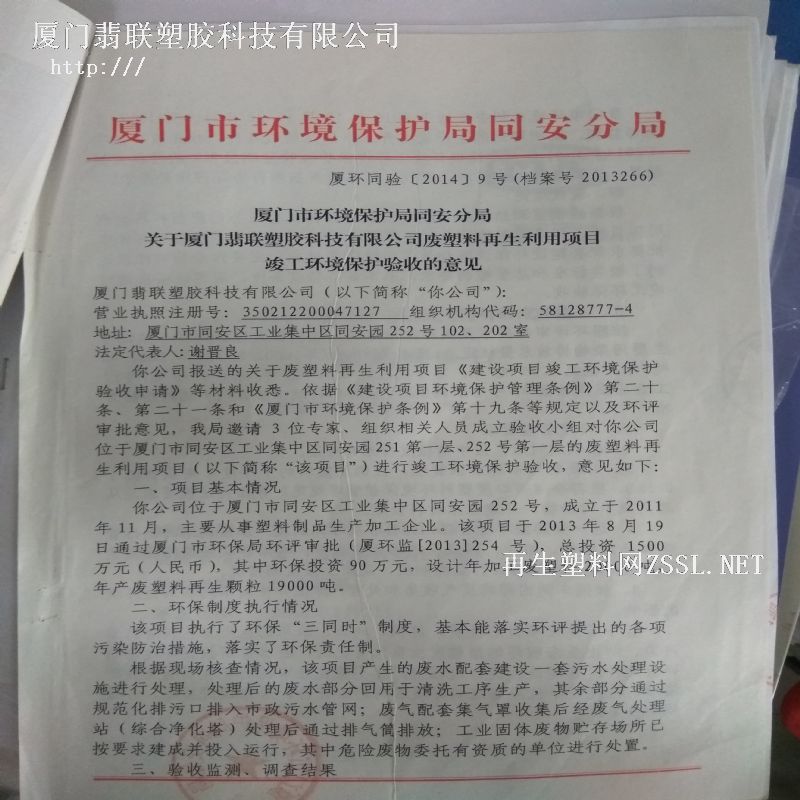 厦门翡联塑胶科技有限公司清洁生产审核验收完成,完成时间2016年9月22日。