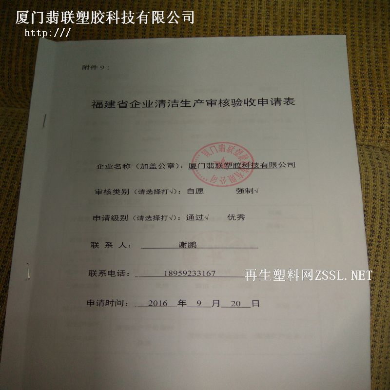 厦门翡联塑胶科技有限公司清洁生产审核验收完成,完成时间2016年9月22日。