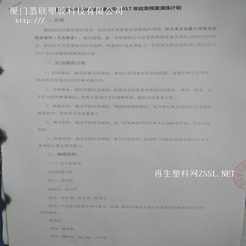 厦门翡联塑胶科技有限公司2017年应急演练 我司于2017年7月15日下午3点举行2017年度应急演练,具体计划和内容如附件。